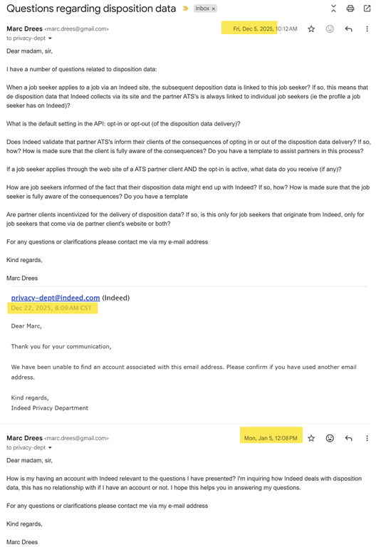 De oppervlakkige lezer (lees: de gemiddelde ATS gebruiker) denkt na het scannen van deze alinea naar alle waarschijnlijkheid dat het wel goed zit met de privacy bij Indeed en dat jouw sollicitant zich geen zorgen hoeft te maken over zijn/haar/x veiligheid.