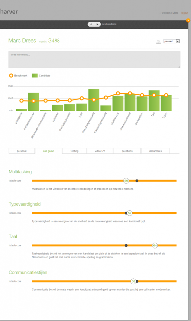 Wat Harver doet? Dat kan ik op dit moment het beste laten zien aan de hand van een praktisch voorbeeld: de Talent Pitch. Dit is een online assessment waarmee arvato Benelux medewerkers voor haar callcenters selecteert. En waarmee arvato tot op heden zeer indrukwekkende resultaten mee heeft geboekt.