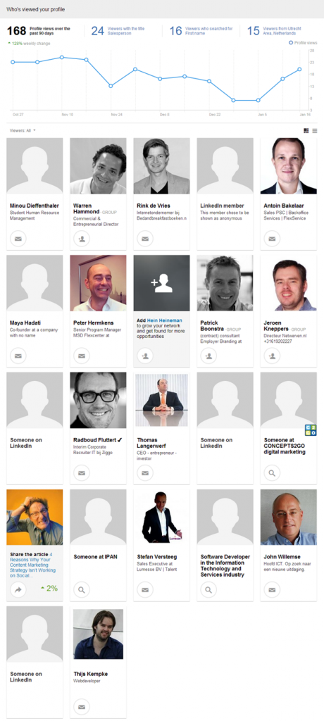 says:Of de bezoekers blij zijn om zonder toestemming te worden afgedrukt weet ik inderdaad ook niet.Nu moet LinkedIn leden zonder foto nog dwingen om wèl een foto te plaatsen, dat ondersteunt digitaal netwerken beter.”Anoniem profiel zònder foto”? Kom dan niet…..”Alleen zichtbaar willen zijn als ‘someone on LinkedIn'”? Kom dan niet…..