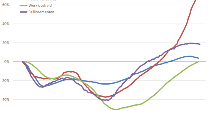 De trendlijnen voor faillissementen is in een voorzichtige daling afgebogen; wat zoveel wil zeggen dat het aantal faillissementen aan het stijgen is. Maar gelukkig is de trendlijn nog altijd een stuk hoger dan in 2008, dus er is nog voldoende buffer