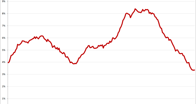 De werkloosheid stuitert wat op de 4%-lijn; voor de beroepsbevolking als geheel is dat blijkbaar het dal. Een dal wat overigens lager ligt dan tijdens de vorige piek, in 2008. Toen kwam de werkloosheid niet lager dan 4,4%.
