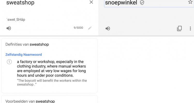 Sweatshops zijn vaak in het nieuws. Een Nederlandse vertaling van dit woord schoot mij echter niet direct te binnen. Gelukkig heeft Google Translate het woord vertaald. En, dubbel boffen, de Google translate community heeft de vertaling geverifieerd: ‘sweatshop’ betekent ‘snoepwinkel’.