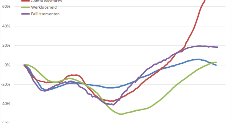 De trendlijn van de werkloosheid zit nog altijd in positief gebied, al steekt het kopje nog nauwelijks boven de nullijn uit. Maar we kunnen voor de werkloosheid nu ook zeggen dat de financiële crisis achter ons ligt. Meer dan tien jaar nadat deze crisis uitbrak. Zolang heeft het bij mijn weten nog nooit geduurd voordat de werkloosheid weer uit het dal van de recessie was geklommen.