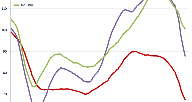 De trendlijn zit nog altijd in een vrije val en is bijna halverwege de indexwaarden van 90 en 80, in de richting van 80 natuurlijk. En zoals we later zullen zien, gedragen de drie sectoren zich hierin allesbehalve gelijkvormig.