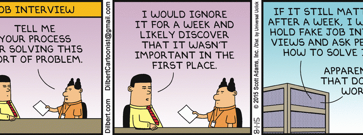 Zondag is al geweest. Daarom maar vandaag, in de onregelmatig verschijnende serie Recruitment Prevention: Dilbert. ZZP’ers klagen er vaak over, maar vandaag leren we dat sollicitanten je probleem op laten lossen niet altijd een goed idee is.