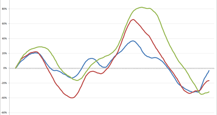 Wat dit patroon interessant maakt, is het gebruik ervan om de toekomst te duiden. We zien een omkering van de trendlijn bij zowel de jongeren als de 25 – 45-jarigen (waarbij dit keer de jongeren niet als eerste maar als tweede omkeren). En het zal waarschijnlijk nog maar 1 maand duren alvorens de jongeren boven de nullijn gaan uitkomen.