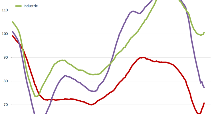 En dan is daar de sector Industrie. Deze sector schiet plotseling omhoog, weg van de grenswaard van 100. Wat is hier aan de hand? Of maakt de industrie soms de call centers van de GGD’s?.