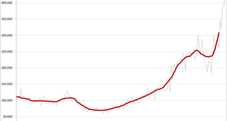 De trendlijn is al boven de 300K uitgekomen en de hoe van de trendlijn doet een verdere steile groei vermoeden. Maar de echte gekkigheid zit natuurlijk in de lijn van de maandelijkse volumes. In de afgelopen maanden heb ik de Y-as steeds verder moeten uitleggen. Waardoor de eens zo interessant lijkende groei van de trendlijn in de jaren van en na de financiële crisis nu bijna is platgeslagen.
