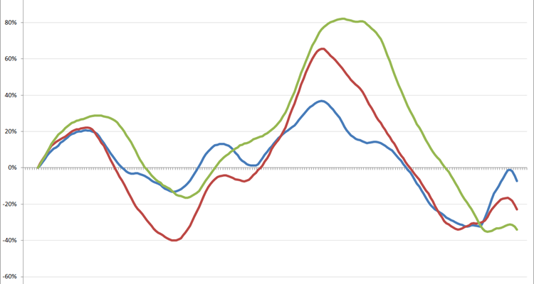 Wat dit patroon interessant maakt, is het gebruik ervan om de toekomst te duiden. We zien een omkering van de trendlijn bij zowel de jongeren als de 25 – 45-jarigen (waarbij dit keer de jongeren niet als eerste maar als tweede omkeren). Het is verrassend om te zien dat de jongeren als eerste de nullijn (=2003) bereiken en dat de 25 – 45-jarigen en de 45-plussers daar alle twee nog ruim vanaf zitten.