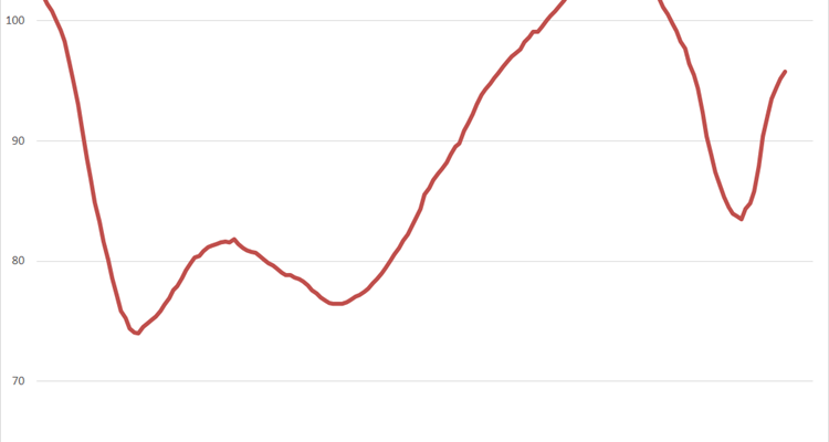 De trendlijn buigt in de laatste periodes o zo voorzichtig af naar minder steile groei. En daarmee zou de grenswaarde van 100 weleens moeilijker te bereiken zijn. En die grenslijn van 100 is de omvang van de uitzendwereld in 2008, vóór/tijdens de financiële crisis. We zijn in al die jaren dus niet veel opgeschoten..