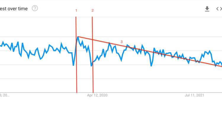 In Google Trends is het altijd interessant te kijken naar online trends en in het bijzonder nu in een andere markt dan van voor de Coronacrisis. Wanneer je in Google Trends kijkt naar het zoekvolume naar ‘vacatures’ in de zoekmachine dan kan je de trend momenten redelijk verklaren.