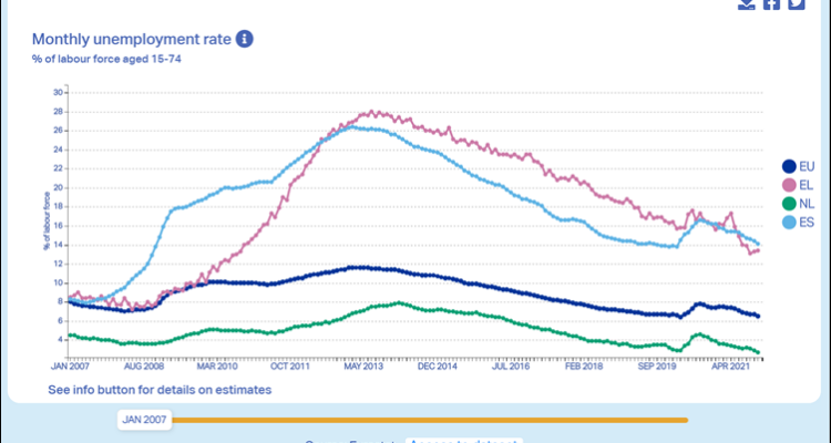 Ik kan ook extra landen aan de grafiek toevoegen (en weghalen, alleen is de interactie hiervoor niet optimaal). In bovenstaand geval zijn dat Griekenland (EL) en Spanje (ES), de tweelingbroers die het hardst werden getroffen door de financiële crisis en nog altijd niet zijn hersteld van de financiële crisis. Nederland is het beste jongetje/meisje/x van de klas. Een fraaie grafiek die binnen een minuut kan worden gemaakt.