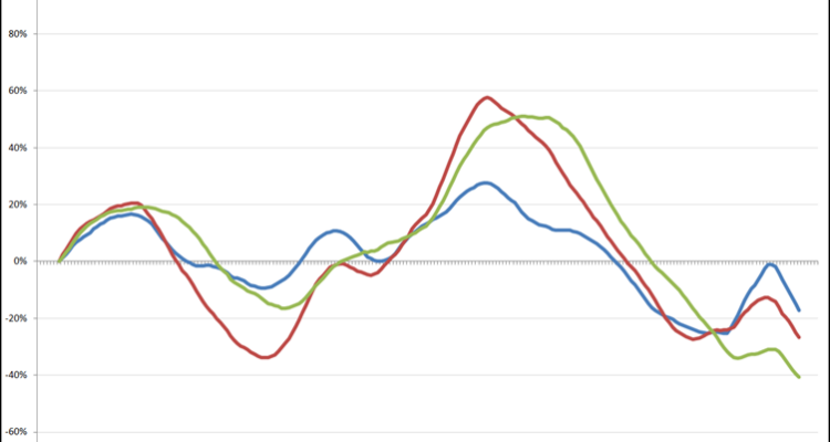 Er is een behoorlijke eensgezindheid tussen de trendlijnen van d 3 leeftijdsgroepen, waarbij er tegelijkertijd (voor een groot deel van de grafiek) er een klein faseverschil is tussen de drie leeftijdsgroepen. De trendlijn van de 15 – 25-jarigen begint meestal iets eerder met een stijging dan de andere twee, en hetzelfde geldt voor een daling.