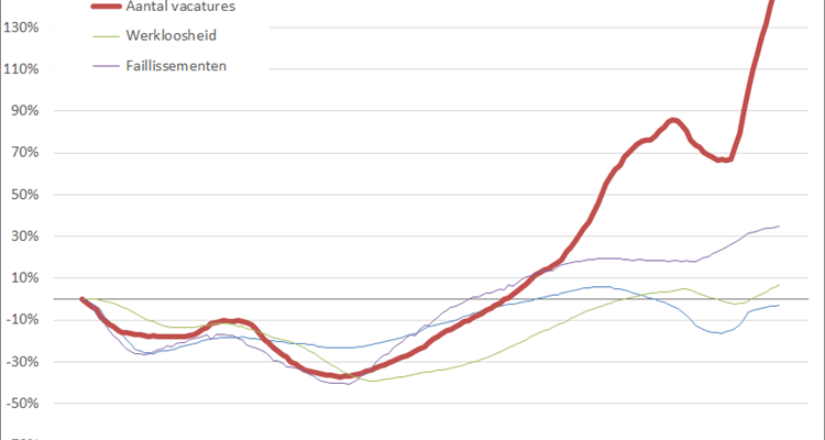 De trendlijn van het Aantal vacatures is als een raket is gestegen. Feest in vacatureland dus, al is het een vraag of deze stijging niet voor een (groot) deel kunstmatig is. De trendlijn voor het vacaturevolume is de enige van de vier trendlijnen die een groei van ruim boven de 100% laat zien. Geen van de andere trendlijnen komen hier in de buurt. Toch gek, vind je niet? Je zou tenslotte verwachten dat de stijging min of meer vergelijkbaar zou verlopen voor gerelateerde indicatoren. En dat is wel het geval voor Werkloosheid en de Uitzendindex, en in mindere mate het volume aan Faillissementen, maar er is geen enkele relatie tussen de drie voornoemde trendlijnen en het Aantal vacatures.