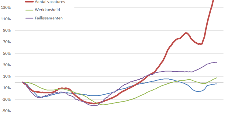 De trendlijn van het Aantal vacatures is als een raket gestegen. Feest in vacatureland dus, al is het een vraag of deze stijging niet voor een (groot) deel kunstmatig is. De trendlijn voor het vacaturevolume is de enige van de vier trendlijnen die een groei van ruim boven de 100% laat zien. Geen van de andere trendlijnen komen hier in de buurt. Toch gek, vind je niet? Je zou tenslotte verwachten dat de stijging min of meer vergelijkbaar zou verlopen voor gerelateerde indicatoren. En dat is wel het geval voor Werkloosheid en de Uitzendindex, en in mindere mate het volume aan Faillissementen, maar er is geen enkele relatie tussen de drie voornoemde trendlijnen en het Aantal vacatures.