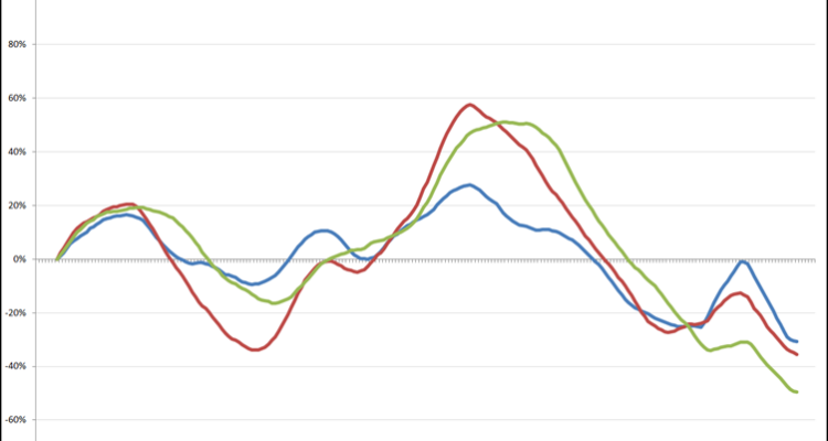 Er is een behoorlijke eensgezindheid tussen de trendlijnen van de 3 leeftijdsgroepen, waarbij er tegelijkertijd (voor een groot deel van de grafiek) er een klein faseverschil is. De trendlijn van de 15 – 25-jarigen begint meestal iets eerder met een stijging dan de andere twee, en hetzelfde geldt voor een daling. Geen opzienbarende ontwikkeling (jongeren vertrekken in het algemeen als eerst tijdens een verslechtering van de arbeidsmarkt, maar worden als eerste weer aangenomen als de situatie verbetert) maar het wordt ook duidelijk weergegeven in de trendlijn.