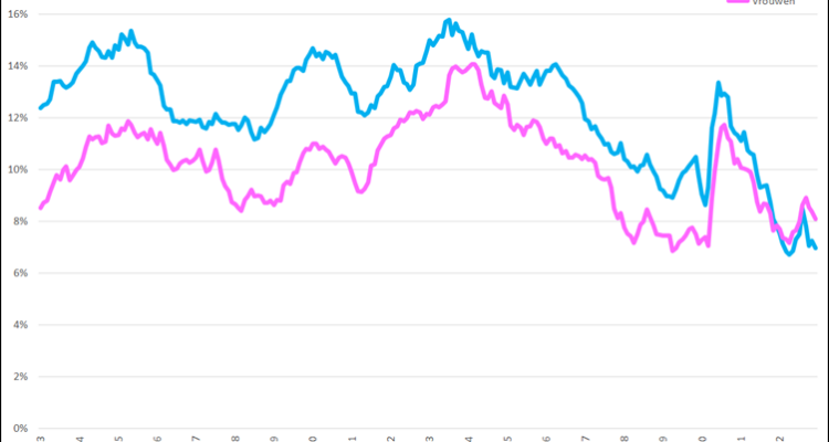 Waar zo’n 20 jaar geleden de werkloosheid onder vrouwen structureel hoger lag dan onder mannen is daar op dit moment geen sprake meer van. Integendeel, er is ondertussen sprake van parity, hoewel in de laatste periode van 2022 mannen er een soort eindsprintje uitpersen. Maar gezien de trend is dit niet houdbaar en dragen beide groepen evenveel bij aan de werkloosheid voor het jongste deel van de beroepsbevolking.