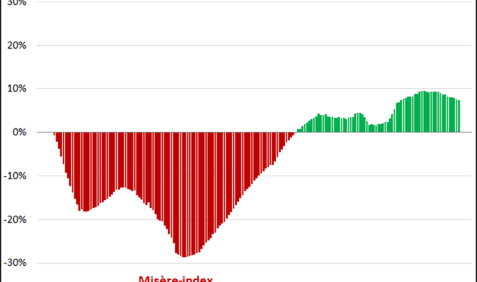 Er tekent zich een duidelijke piek af waarbij we ondertussen ondubbelzinnig in de scherpe dalende lijn zitten. Aangezien de toekomst zich niet toont tot het heden is geworden kan er nog geen harde conclusie worden getrokken uit de neergaande lijn, anders dan dat de trend neerwaarts is. En dat is op zich al het vermelden waard. Maar er is natuurlijk meer, zo laat de jubel/misere-index een trage maar gestage daling zien: