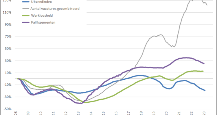 De uitzendindex vertoon ondertussen alweer geruime tijd een neergaande lijn. Een treurige zaak en voor uitzend-watchers ook een belangrijk signaal van een mogelijke omslag in de economie. De uitzendindex loopt gebruikelijk een aantal maanden voor op negatieve signalen bij de andere trendlijnen en is dus een belangrijke indicator. Hierbij is het misschien goed om op te merken dat vooral administratief uitzenden grote klappen krijgt en zelf slechter presteert dan tijdens de financiële crisis. Voor meer detail, zie ABU: ik kan de recessie bijna ruiken.