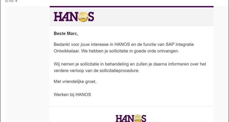 Hier haperen wat zaken zoals een onvolledige titel (ik mis de functietitel), ik heb geen ‘interesse’ in functie maar ik heb gesolliciteerd op een functie, en niet-concrete termijnen in het vervolg van het sollicitatieproces. En omdat deze e-mail eigenlijk een kopie van een bedanktpagina zou kunnen zijn, mis ik ook alle hierboven genoemde punten. Desondanks is deze e-mail eigenlijk de beste ervaring die ik tijdens de candidate journey van Hanos heb gehad.