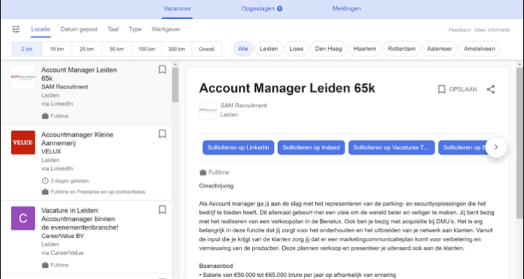 Maar als ik vervolgens kijk naar de Google for Jobs interface dan zie ik het volgende: