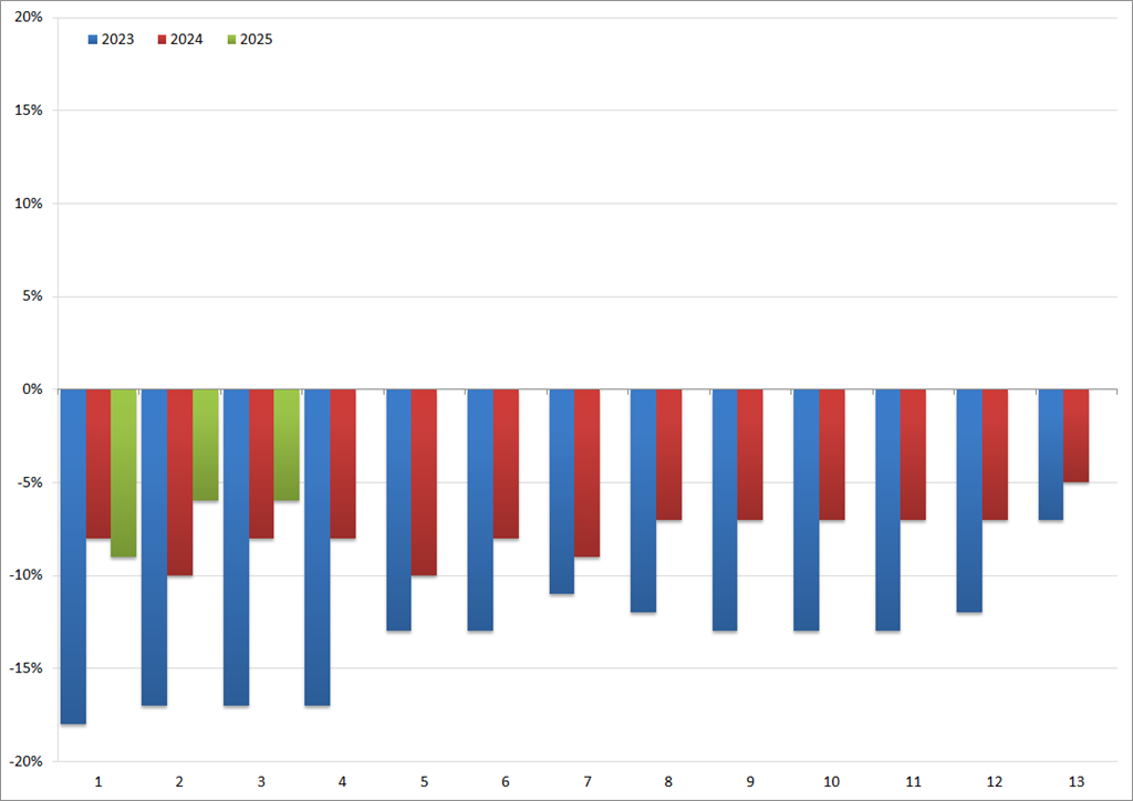 In onderstaande grafiek is de procentuele toe- danwel afname over de 13 periodes van de jaren 2023 t/m 2025 weergegeven:![]()