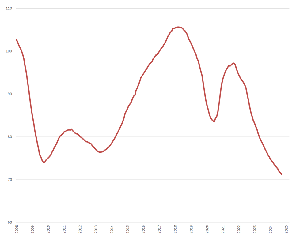 De sector Industrie laat een aanzienlijk kleinere daling zien in vergelijking met de ander twee sectoren. Hier kunnen we nog hopen op een stabilisatie op relatief korte termijn . Deze sector is onze beste hoop op een lichtpuntje in 2025.