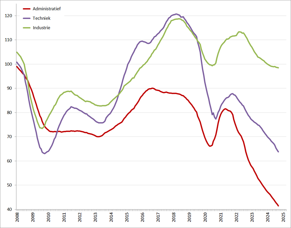 De sector Techniek gaat eveneens behoorlijk steil omlaag, en de dalingshoek is wederom iets steiler geworden. Ook hier is de vraag niet of maar wanneer de trendlijn dieptes gaat verkennen die nog niet eerder zijn gezien. Ook bij deze sector lijkt het een kwestie van een paar periodes, hoewel de sector Administratief de ‘beste’ papieren heeft om als eerste een grenslijn te doorbreken.