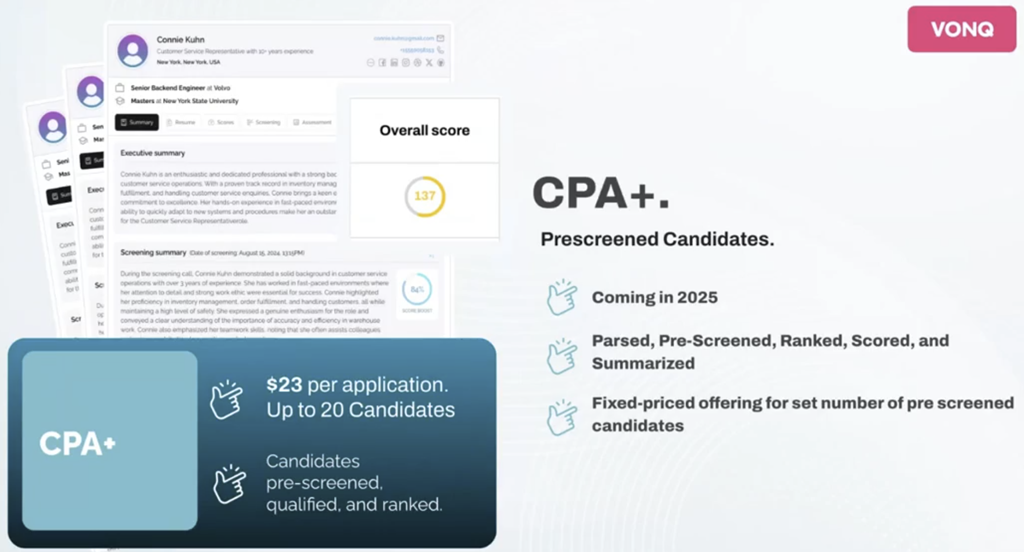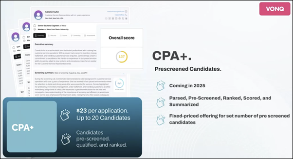 Er is echter een vierde optie, die waarschijnlijk voor elke recruitment medewerker de voorkeur zou hebben gehad: Cost Per Applicant. En dat is ook de betekenis die VONQ er aan geeft. Waarbij de + de werkelijke meerwaarde van het aanbod weergeeft, namelijk dat de applicant is gescreend met behulp van meerdere van de AI Agents die VONQ heeft gerealiseerd.