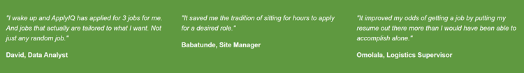 Babatunde: O, wat fijn! In plaats van een vacature grondig te bestuderen voordat ik ervoor kies om te solliciteren, is daar nu ApplyIQ! Die het in een seconde voor mij doet. Meer tijd om mijn teennagels te knippen!!