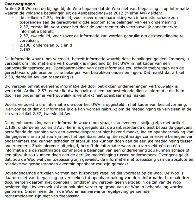 - Artikel 2.53, derde lid Aw (economische belangen van ondernemingen) beschermt inschrijvers tegen het vrijgeven van concurrentiegevoelige informatie. Echter, het verzoek ziet niet op bedrijfsgevoelige gegevens van 8vance, maar op de besluitvorming van UWV zelf.