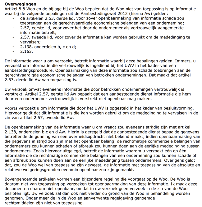 - Artikel 2.138 en 2.163 Aw (schade eerlijke concurrentie) gaat over het niet prijsgeven van concurrentiegevoelige gunningsinformatie. Dit geldt niet voor documenten die inzicht geven in het besluitvormingsproces van UWV.