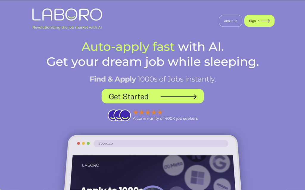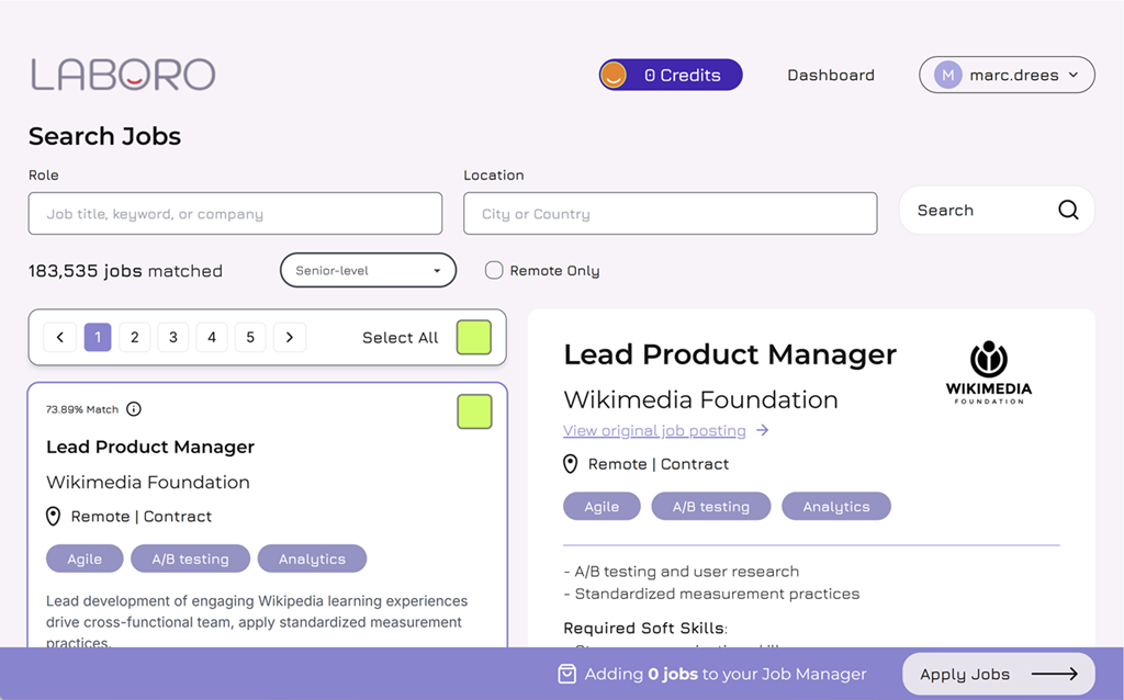 Laboro claimt ook de meest recente vacatures voor haar bezoekers te ontsluiten, en ook nog eens het geparsde cv van een bezoeker te matchen met die vacatures, en cv’s en motivatiebrieven op maat te maken. En natuurlijk in bulk solliciteren. En daarmee doet Laboro zich op het zichtbare deel van de homepage ernstig tekort. Het is feitelijk een one-stop, all-in zoek t/m solliciteer site waarbij ook nog eens een sollicitatie-management functie zit. Iets meer dan een sollicitatiemitrailleur dus.