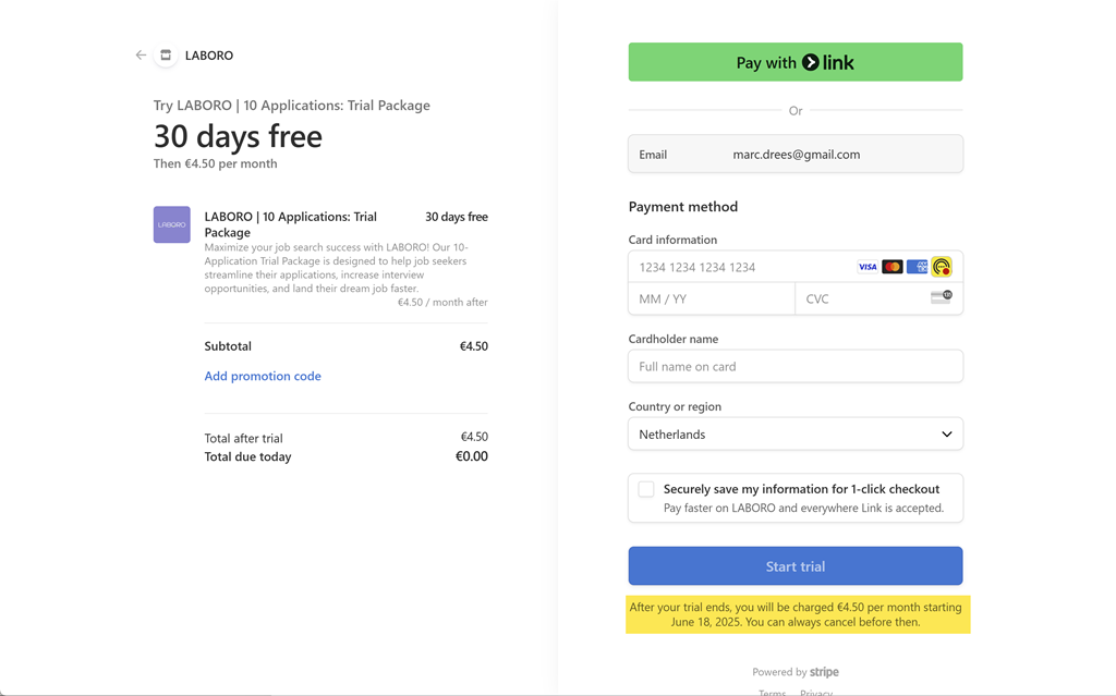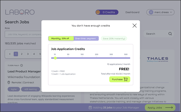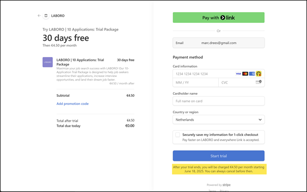 Blijkbaar kan ik niet solliciteren als ik geen geld overhandig aan Laboro. dus klik ik op de knop Purchase:![]()
