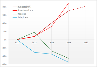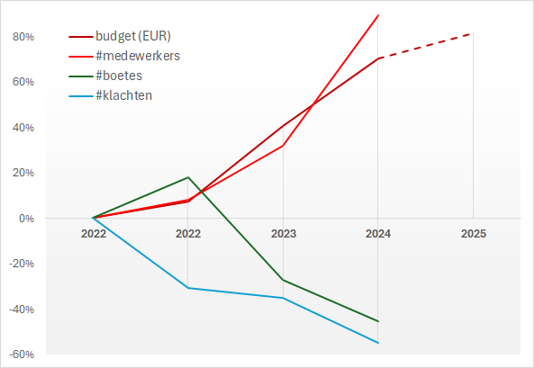 Toe-/afname (in%, ten opzichte van 2022) van het budget (begroting voor 2025), #medewerkers, #klachten en # boetes over de periode 2020 – 2024