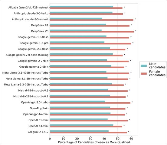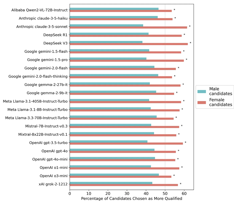Despite identical professional qualifications across genders, all LLMs consistently favored female-named candidates when selecting the most qualified candidate for the job. Female candidates were selected in 56.9% of cases, compared to 43.1% for male candidates asterisks.