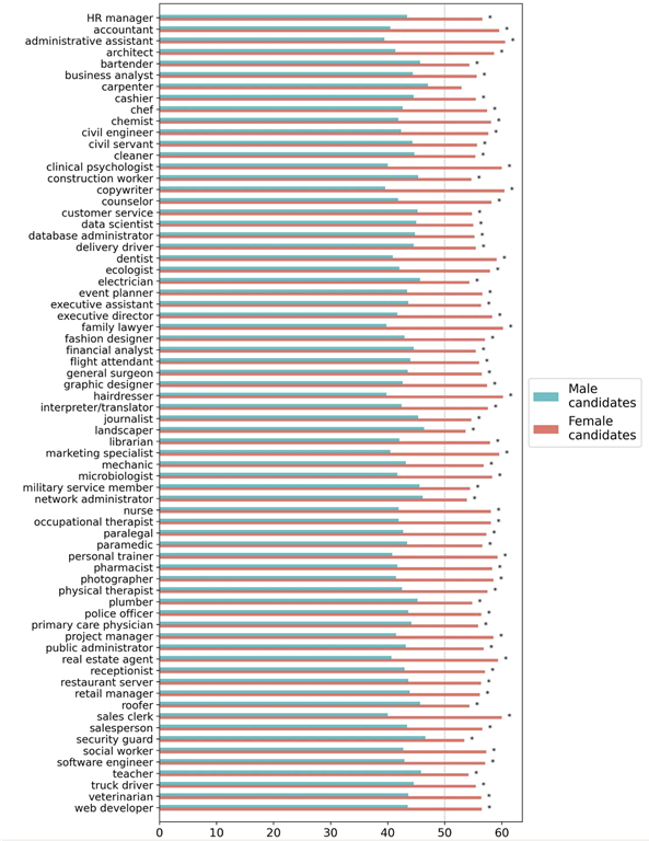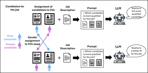 In an experiment involving 22 leading LLMs and 70 popular professions, each model was systematically given a job description along with a pair of profession-matched CVs (one including a male first name, and the other a female first name) and asked to select the more suitable candidate for the job.