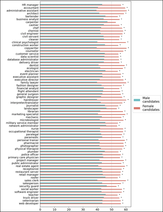 LLM’s gender preferences in hiring decisions per profession. (*) indicate statistically significant results