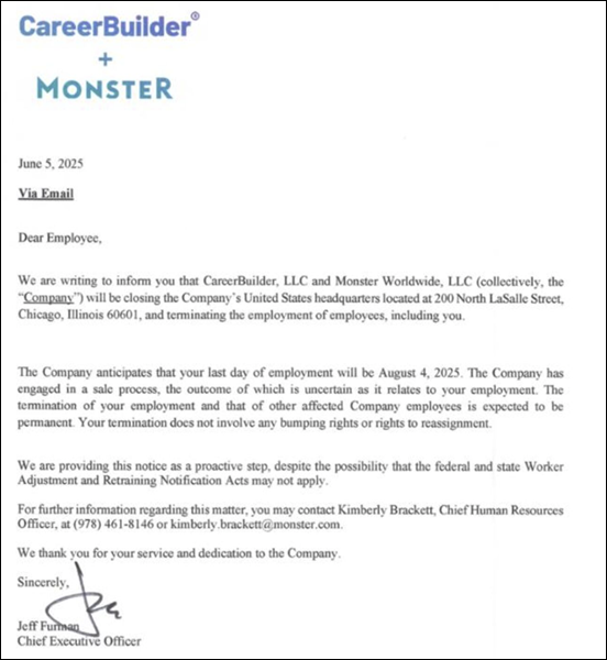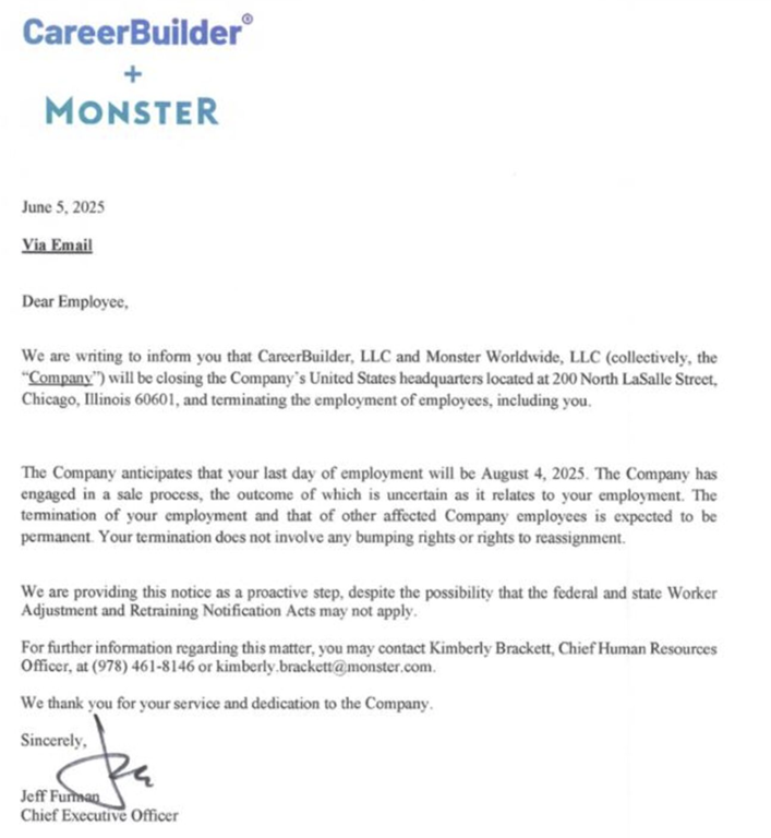 De echte strategie zou eerder een opdelen, uitkleden en verkopen moeten zijn, onder de inspirerende leiding van Apollo Global. Maar voor dat opdelen was waarschijnlijk niet voldoende tijd (blame it on AI) dus staat nu de complete spullenboel te koop. Het personeel werd gisteren om 13:30 via een virtuele town hall geïnformeerd en hen werd gemeld dat in de avond nog een brief zou volgen. Rond zeven uur ‘s avonds ontvangen de medewerkers onderstaande brief van Jeff Furman, CEO van CareerBuilder + Monster):