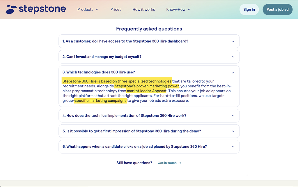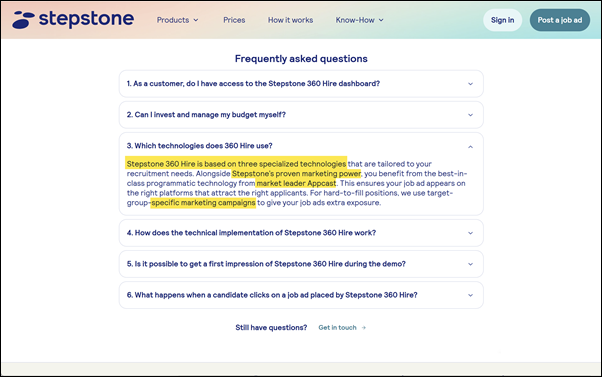 Overigens lijkt het er serieus op dat Stepstone 360 Hire niet veel meer is dan een opgeleukte Appcast instance, met wat couleur locale in termen van marketing inspanningen:![]()