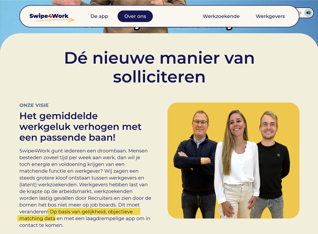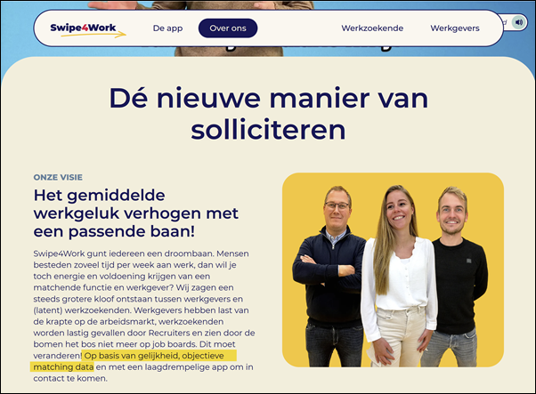 Objectieve matching data bestaat volgens Swipe4work uit geschoonde informatie, nl. geen leeftijd, geslacht of ras. Altijd handig voor een uitzendbureau die alleen maar op zoek is naar pensionado’s, al mogen we dit als corner case beschouwen. En het is natuurlijk een wassen neus want één stap verder in het proces wordt dat toch allemaal wel duidelijk. Maar goed, het streven is loffelijk.