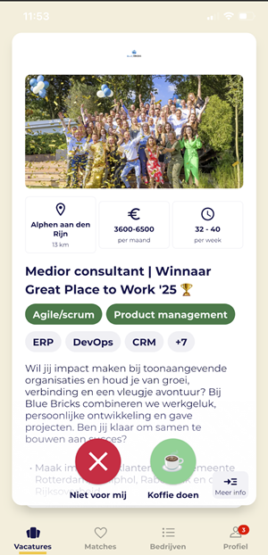 Verder is de naamm van de werkgever niet te zien, tenzij je op het meer info knopje (rechts onderaan) klikt. Daar is dan ook een grote knop Meer over <werkgever> te vinden, die ik overigens niet heb aangeklikt. Ik was namelijk afgeleid door het feit dat je nu niet langer gebruik kan maken van de swipe functie. En dat vond ik verdomde onhandig.