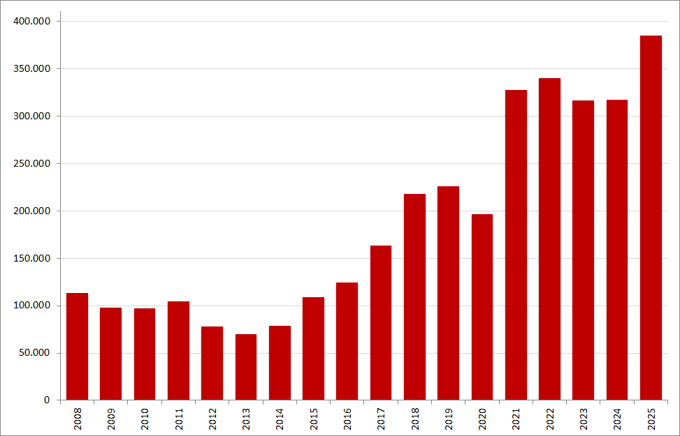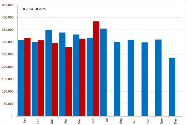 We zetten de ‘eeuwigdurende’ serie over het online vacaturevolume onverdroten voort met de cijfers van juni 2025. En we hebben er weer een record bij! Nog nooit was het vacaturevolume in juni zo hoog als dit jaar: bijna 385.000 vacatures. Alsof je een emmer leeggooit! En ook nog eens substantieel hoger dan het vorige juni-record (2022) van 340.000. De tijd van somberen (komen we ooit nog eens boven de 300K) lijkt geschiedenis te zijn geworden, maar laten we niet al te gek gaan doen, want daar is het op dit moment veel te warm voor…