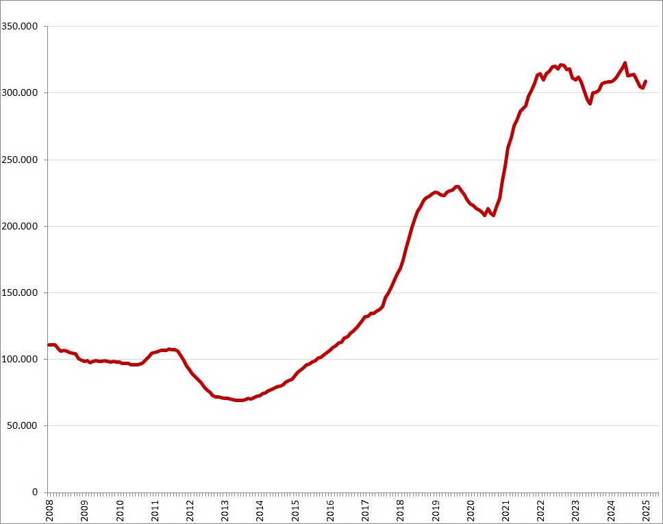 Om het vacaturevolume van juni 2025 in een nog breder perspectief te plaatsen is het goed om ook de langere termijn in ogenschouw te nemen. In onderstaande grafiek is het 12-maands gemiddelde van het maandvolume over de afgelopen jaren weergegeven:
