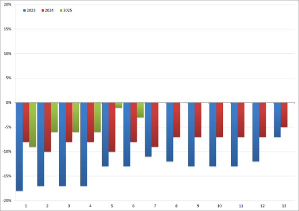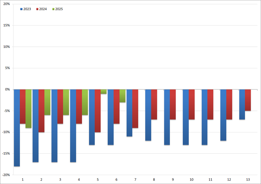 In onderstaande grafiek is de procentuele toe- danwel afname over de 13 periodes van de jaren 2023 t/m 2025 weergegeven:![]()