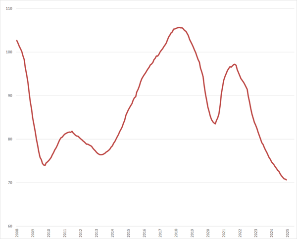 Trendlijn index uitzenduren op basis van ABU periodecijfers, periode 2008 – heden (2006 = 100)
