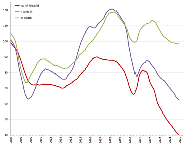 De sectoren laten een gevarieerd beeld zien. De sector Administratief dondert met -15% wederom verder in elkaar, de sector Industrie komt met een stijging (6%), en de Techniek krimpt met –6%.