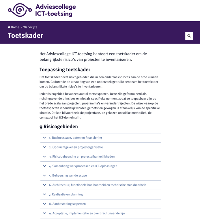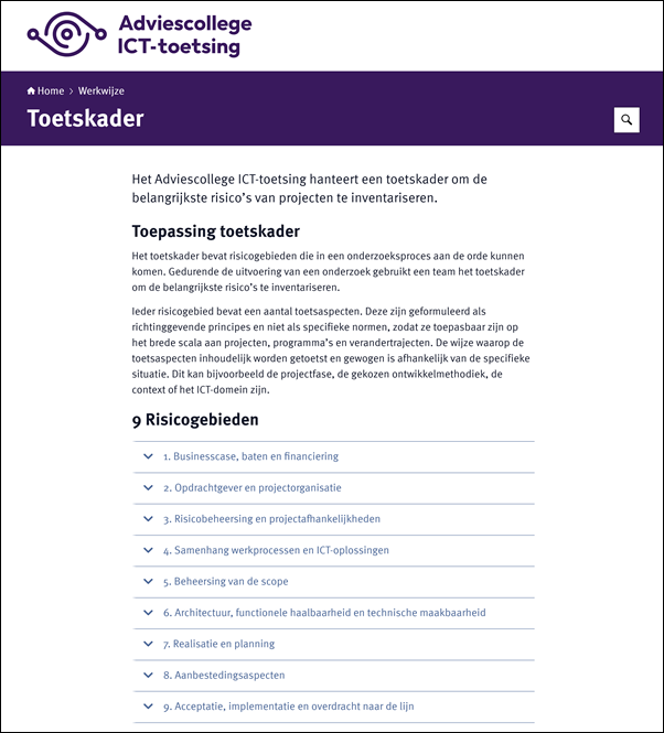 Dit is wat het Adviescollega als het toetskader ziet, onderverdeeld in negen risicogebieden:![]()