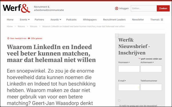 Om de integriteit (danwel het volledige gebrek daaraan) te bespreken wil ik zijn meest recente artikel onder de aandacht brengen: Waarom LinkedIn en Indeed veel beter kunnen matchen, maar dat helemaal niet willen.