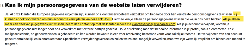 Ik kom ook op bovenstaande pagina uit als ik CareerBuilder.com invoer. Feitelijk zit ik nu op de LiveCareer website die voor de gelegenheid ook helemaal in het Nederlands is getransformeerd. Het lijkt me verstand om als eerste maar eens te vragen aan LiveCareer om mijn gegevens te laten verwijderen. Daarvoor ga ik naar de contactpagina: